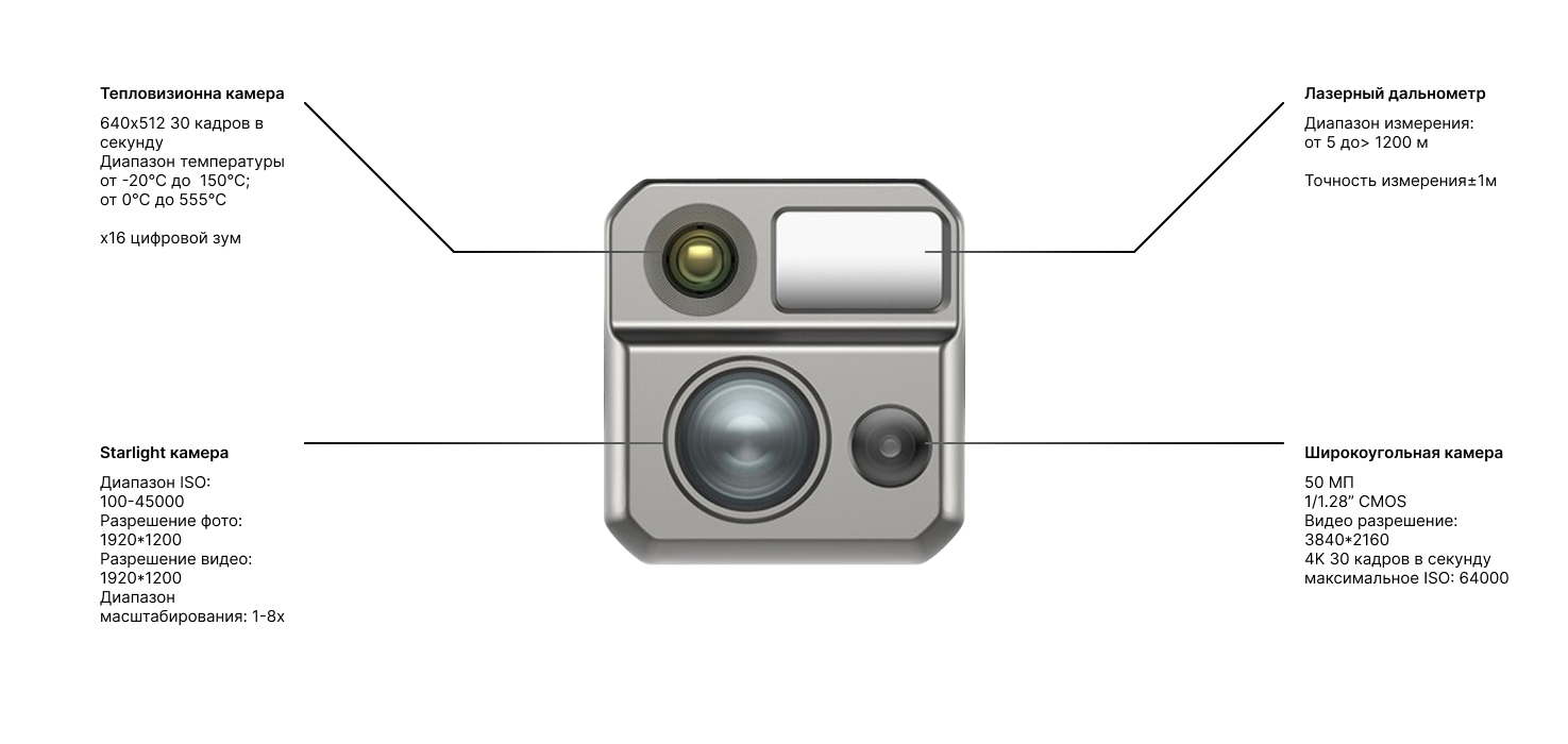 - Распознавание и отслеживание нескольких целей Типы идентификации целей: люди, транспортные средства, лодки, летающие объекты, огонь, Количество обнаруживаемых целей: 64. Высокая точность распознавания: > 85>#/li###