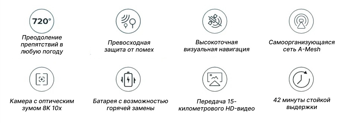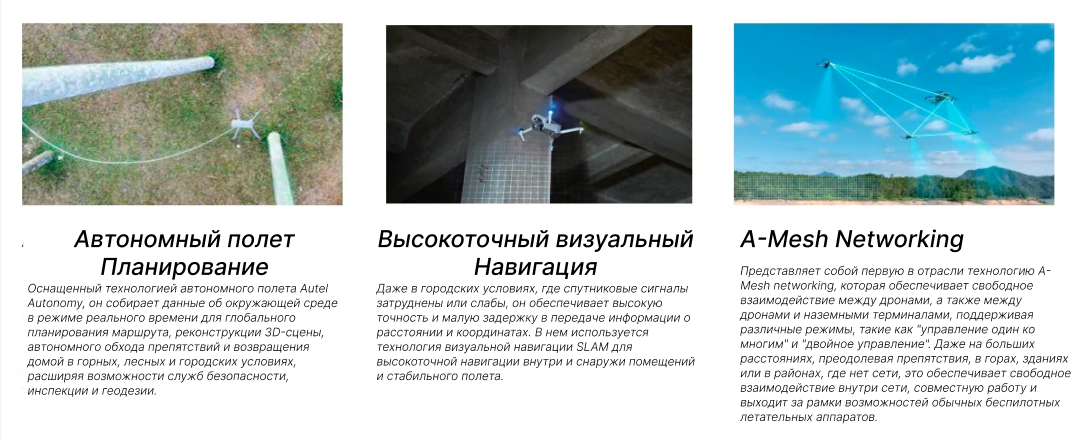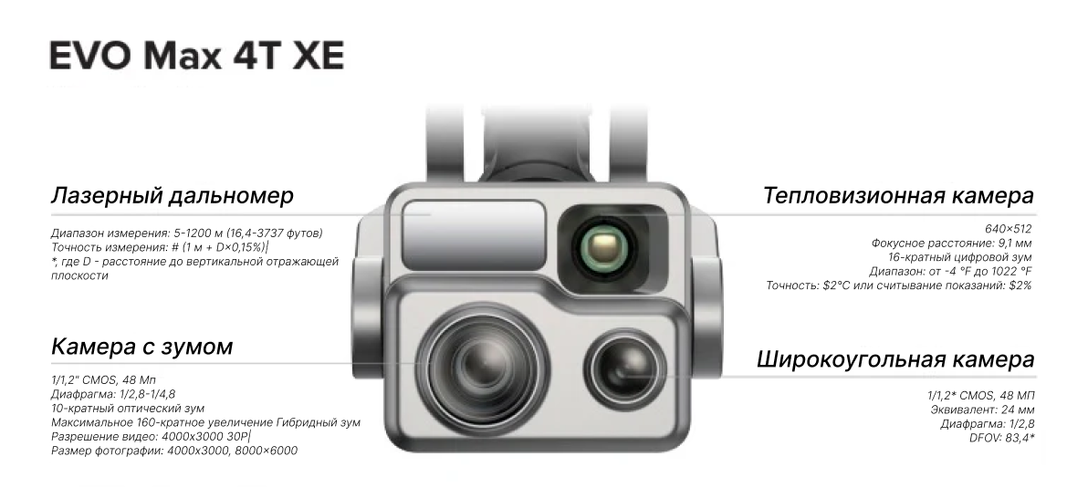 ОписаниеЛучшие характеристики в классеВ EVO Max 4T XE используется технология автономного полета Autel Autonomy, обеспечивающая глобальное планирование траектории, трехмерное воссоздание сцены, автономное избегание препятствий и возвращение домой в сложных условиях. Высокоточная система визуальной навигации обеспечивает стабильный и надежный полет в условиях сильных помех, перебоев сигнала или слабых сигналов.В этом дроне впервые в отрасли применена сетевая технология A-Mesh, поддерживающая свободное объединение нескольких устройств в сеть для интегрированного покрытия сети «воздух-земля».Сочетание мультисенсорной технологии восприятия «бинокулярное зрение рыбий глаз + радар миллиметровых волн» обеспечивает круговой обзор в 720° и возможность обхода препятствий, позволяя работать в любую погоду.EVO Max 4T XE оснащен камерой FusionLight 4T XE, что объединяет камеру 4K с 10-кратным непрерывным оптическим зумом, сверхчувствительную широкоугольную камеру, тепловизионную камеру и лазерный дальномер, эффективно расширяя возможности общественной безопасности, энергетической инспекции, управления чрезвычайными ситуациями и устанавливая новый стандарт для применения дронов в промышленности.Autel EVO Max 4T XE — это высокотехнологичное устройство, предназначенное для решения задач в области общественной безопасности, инспекции и управления чрезвычайными ситуациями. Он сочетает в себе передовые функции и мощные технологии, что делает его идеальным инструментом для профессионалов.КомплектацияДрон Autel EVO Max 4TXE — 1 шт.Аккумулятор — 1 шт.ЗУ для аккумулятора и провод питания — 1 шт.Запасные пропеллеры (пара) — 1 шт.Отвертка — 1 шт.Пуль управления — 1 шт.Ремешок для ношения пульта на шее — 1 шт.Защитный чехол для пульта управления — 1 шт.Запасные джойстики (пара) — 1 шт.ЗУ для пульта управления — 1 шт.Кабель для зарядки пульта — 1 шт.Кабель для передачи данных — 1 шт.Документация — 1 шт.Кейс — 1 шт.КамераШирокоугольная камера:1/2" CMOS, 48 МП эффективных пикселей - F/2.8Зум-камера:1/2" CMOS, 10-кратный оптический зум, фокусное расстояние: 11.8-43.3 мм, 48 МП эффективных пикселейИК-камера:фокусное расстояние 9.1 мм - угол обзора 61°, разрешение 640x512, диапазон измерений от -20°C до +550°CЛазерный дальномер:диапазон измерений 5-1200 м, точность измерений ± 1 мСистема ДатчиковДиапазон обнаружения препятствий Впереди/сверху/снизу/сзади/по сторонам: 0,2~50 мУгол обзора Впереди/сзади/по сторонам: 60°(Г), 80°(В)Сверху/снизу: 360°(Г), 190°(В)Ключевые особенности-720° всестороннее избегание препятствий в любых погодных условиях-Высокая устойчивость к помехам-Высокоточная визуальная навигация-Сеть самоорганизации A-Mesh-8K камера с 10-кратным оптическим зумом-Гибридный зум 160x-Горячая замена аккумулятора-HD видеопередача на расстояние до 15 километров-Время полета до 42 минут