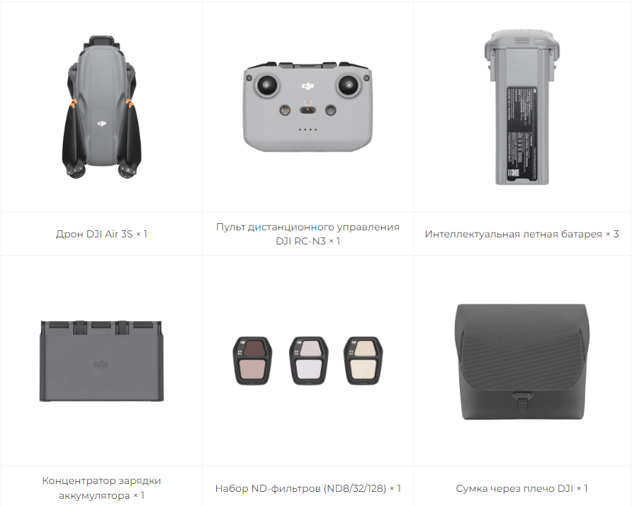 ОписаниеDJI Air 3S (DJI RC-N3)Основная камера CMOS 1″14 ступеней динамического диапазона,[1]большой размер пикселя 3,2 мкм,[2]эквивалент формата 24 мм и разрешение 50 МП позволяют снимать обширные пейзажи днем и ночью.70-мм телекамера среднего размера48-мегапиксельная CMOS-матрица размером 1/1,3 дюйма, соответствующая характеристикам видео и цветовым режимам основной камеры, а также обеспечивающая 3-кратный оптический зум для выразительных портретных снимков.Двойная камера 4K/60 кадров в секунду HDR-видеоИспользует кодирование H.265, поддерживая HDR-видео 4K/60 кадров в секунду, видео 4K/120 кадров в секунду[3]и 10-битный цветовой режим D-Log M.Свободная панорамаСоздавайте цельные панорамные снимки с помощью режима свободной панорамы, который объединяет несколько изображений с выбранным вручную объектом или областью.Всенаправленное обнаружение препятствийПередний LiDAR, направленный вниз инфракрасный датчик ToF и три пары датчиков зрения позволяют ночной съемке[4]обнаруживать и избегать препятствий.Интеллектуальный RTH нового поколения с повышенной точностьюDJI Air 3S может запоминать траектории полета в хорошо освещенных условиях[5]для безопасного возвращения, даже при взлете из зон без спутниковых сигналов.45-минутное время полетаБлагодаря полетному времени до 45 минут[6]Air 3S дает вам достаточно времени, чтобы разведать локации, скомпоновать кадр, сделать отличные снимки и повторять все это снова и снова.Передача видеосигнала на расстояние 20 кмВидеопередача DJI O4 обеспечивает передачу 10-битного видео с разрешением 1080p/60 кадров в секунду на расстояние до 20 км[7], предлагая четкую прямую трансляцию.Примечания:* Все видео и изображения на этой странице были сняты с помощью DJI Air 3S профессионалами в строгом соответствии с местными законами и правилами и были различным образом отредактированы на этапе постобработки. Все видео и изображения предназначены только для справки. Фактические результаты могут отличаться. Всегда соблюдайте местные законы и правила и убедитесь, что самолет получил соответствующие сертификаты и разрешения на полеты в воздушном пространстве перед полетом.** Все данные на этой странице были собраны с использованием серийной модели DJI Air 3S в контролируемой тестовой среде. Фактический опыт может отличаться в зависимости от среды, использования и версии прошивки. Перед использованием DJI Air 3S необходимо активировать через приложение DJI Fly.*** Рекомендуется использовать функцию ActiveTrack 360° в открытых средах. Обратитесь к руководству пользователя для неподдерживаемых сценариев или тех, которые могут потенциально прерывать запись. В сложных средах с большим количеством препятствий проявляйте осторожность при использовании автоматического режима, чтобы обеспечить безопасность полета и личную безопасность.**** Все изображения, видео и содержимое экрана дисплея о самом продукте на этой странице предназначены только для справки. Фактические эффекты продукта (включая, помимо прочего, внешний вид, цвет и размер) и содержимое экрана дисплея (включая, помимо прочего, фоны, пользовательский интерфейс и иллюстрации) могут отличаться.1. 14 ступеней динамического диапазона достижимы для видео в автоматическом режиме, но не для вертикального или замедленного видео.2. Достигнуто с помощью методов QBC (Quad Bayer Coding), которые объединяют четыре пикселя в один. Не подде