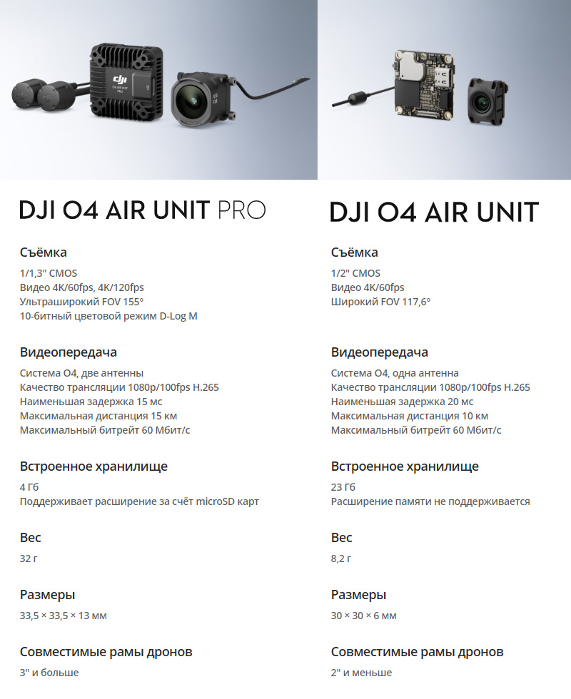 ОписаниеDJI O4 Air Unit и O4 Air Unit Pro — цифровые модули видеопередачи и управления дроном. От предшественников отличаются более высоким разрешением картинки, более низкой задержкой и увеличенной дальностью связи.DJI O4 Air Unit Pro предназначен для больших (от 3 дюймов) синевупов: он больше и мощнее, весит всего 32 г, оборудован камерой с 1/1,3" матрицей умеет записывать видео в 4К 120 кадр/с. Минимальная задержка составляет 15 мс, максимальная дальность — 15 км, а максимальный битрейт — 60 Мбит/с.Особенности DJI O4 Air Unit ProУльтраширокий угол обзора 155°. Делает полёты в сложных локациях проще, а видео более захватывающим.Видео в 4К 120 кадр/с. Модуль записывает кинематографичное видео высокого качества.10-битный цветовой профиль D-Log M. Сохраняет больше информации о деталях в тенях и в ярко освещённых областях, что обеспечивает широкий спектр возможностей на постобработке.Несколько режимов стабилизации. Можно как включить функцию стабилизации RockSteady, которая будет работать в режиме реального времени, так и применить Gyroflow на постобработке.Поддержка режима Canvas и Betaflight OSDНастройте отображение нужной вам информации на экране — модуль поддерживает режим Canvas и настройки Betaflight OSD.Светофильтры от Avata 2Снимайте даже во время яркого полуденного солнца — к камерам модулей серии O4 подходит набор нейтральных светофильтров (ND8/16/32) от DJI Avata 2. Они позволяют изменять количество поступаемого на сенсор света и скорость работы затвора, что важно для получения кинематографичных кадров.Совместимость с пультами и очкамиDJI O4 Air Unit Pro совместим с очками DJI Goggles 3 и DJI Goggles N3 при использовании с пультом управления DJI FPV Remote Controller 3, а также с очками DJI Goggles 2 и DJI Goggles Integra при использовании с пультом DJI FPV Remote Controller 2.Сравнение версийКомплектация1 × Модуль камеры DJI O4 Air Unit Pro1 × Модуль видеопередатчика DJI O4 Air Unit Pro2 × Антенна DJI O4 Air Unit Pro1 × Кабель 3-в-1 DJI O4 Air Unit Pro